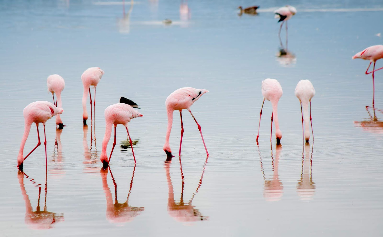 | Flamingos looking for algae to feed on in lake Amboseli |
