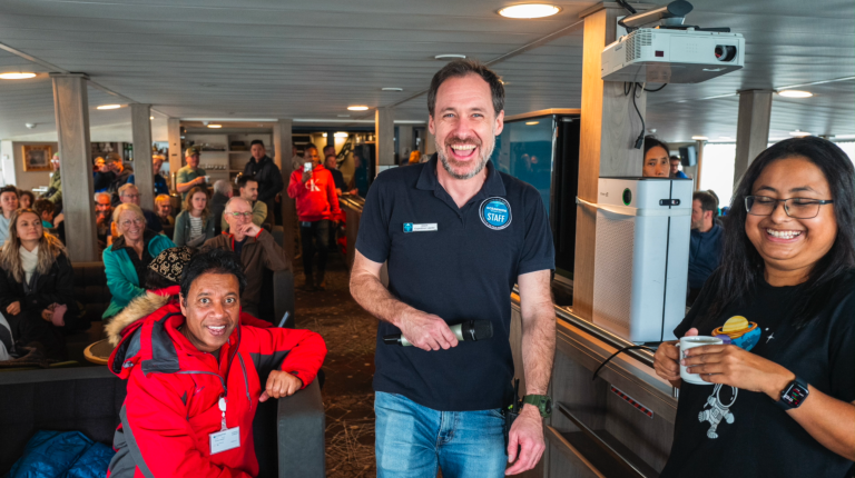 Good morning, good morning, good morning. Our first day on our new home, Plancius, began with a wakeup call from our Expedition Leader, Adam. Every day he used to wake us up through the PA system. This was indeed a unique way he has developed for which he will be remembered by us all.