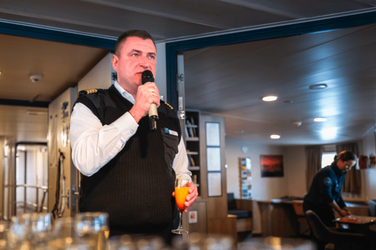 We had to go through the mandatory emergency drill before being treated to some snacks and a customery glass of bubble after meeting our captain and the expedition team for a toast to a successful voyage.