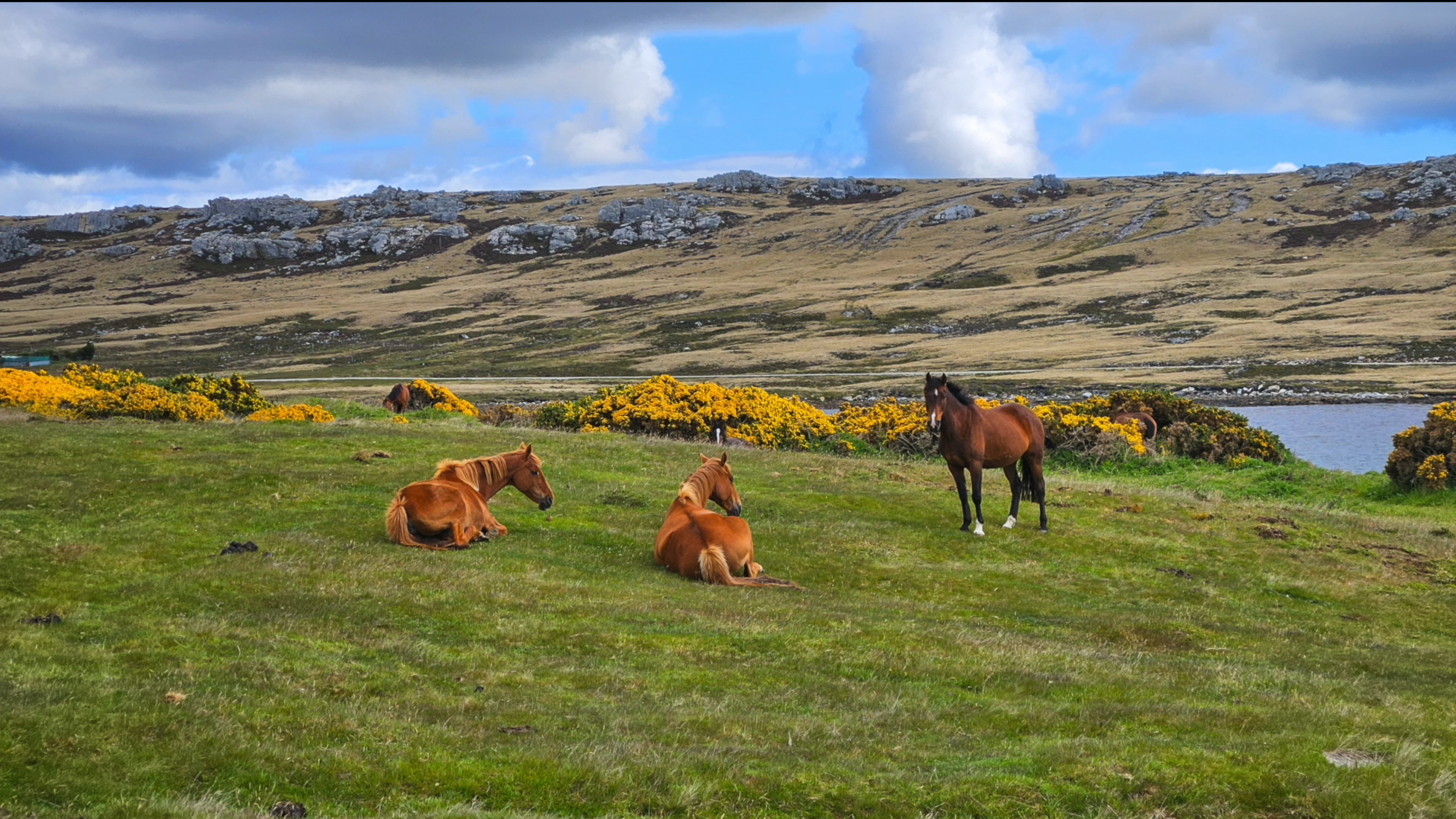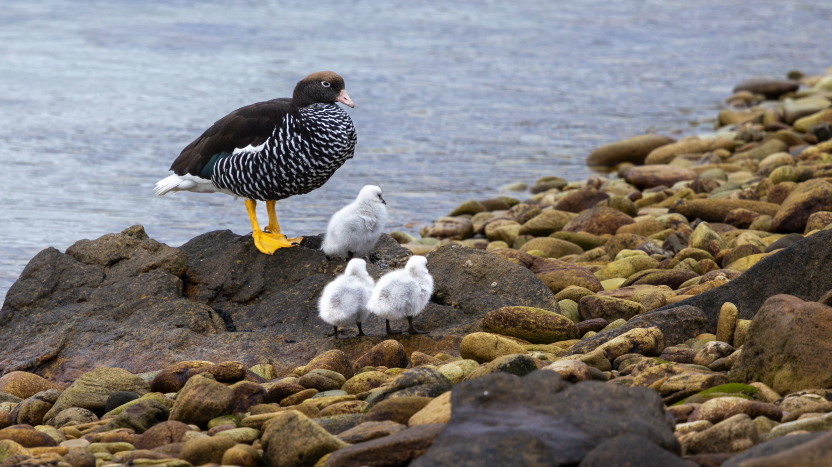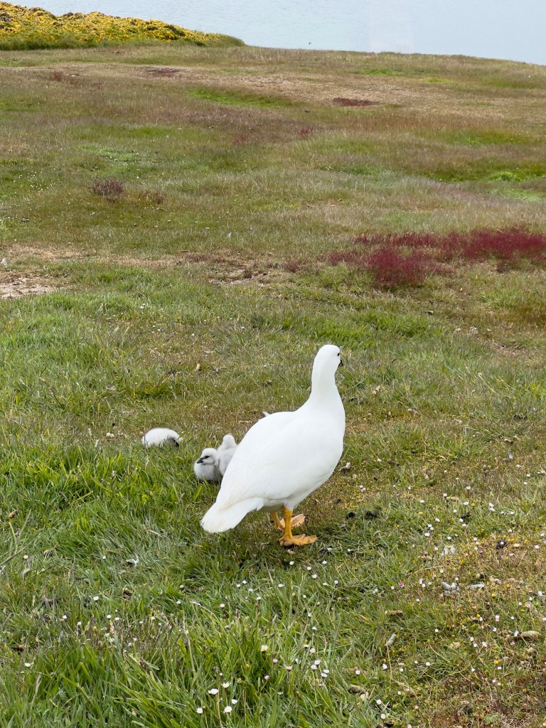 Our route to West Point took us through the Wooly Gut. A narrow passage with Black-browed albatross and Magellanic penguins on the shores and in the water. We rounded the last corner of the passage and the settlement of West Point appeared with two small sail boats anchored just off the beach. Thijs and Kiki were at the pier to greet us as we arrived and offered rides to the bird colonies in their Land Rovers. Many of the ducks and geese had ducklings or goslings with them. The gorse created bright pops of yellow on the slopes of the island.