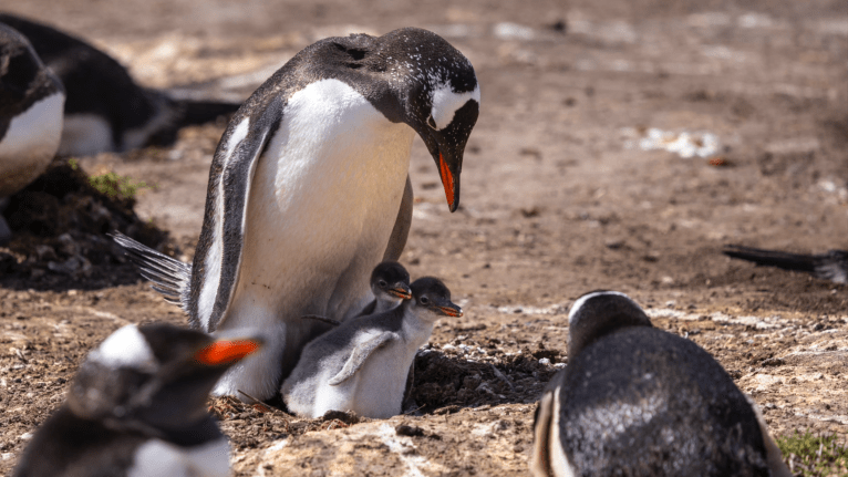 The rain picked up as we left West Point and headed back to Plancius for lunch. Luckily conditions cleared just as we arrived at Saunders Island. Gentoo penguins greeted us on a white sandy beach. The caretakers of the island and their adorable dogs met us ashore and enjoyed the sunny afternoon with us. While exploring the island we had the ability to see 4 species penguins: gentoo penguins, king penguins, Southern rockhopper penguins, and Magellanic penguins. Many of the gentoo penguins had two successful chicks tucked in their nests. The Magellanic penguins were coming and going from their burrows on the slope as sheep were grazing nearby – a peak Falkland Islands image. The black-browed albatross colonies were spread out on the slopes on the far side of the island and we had such nice weather that we could walk to them all and have a visit.