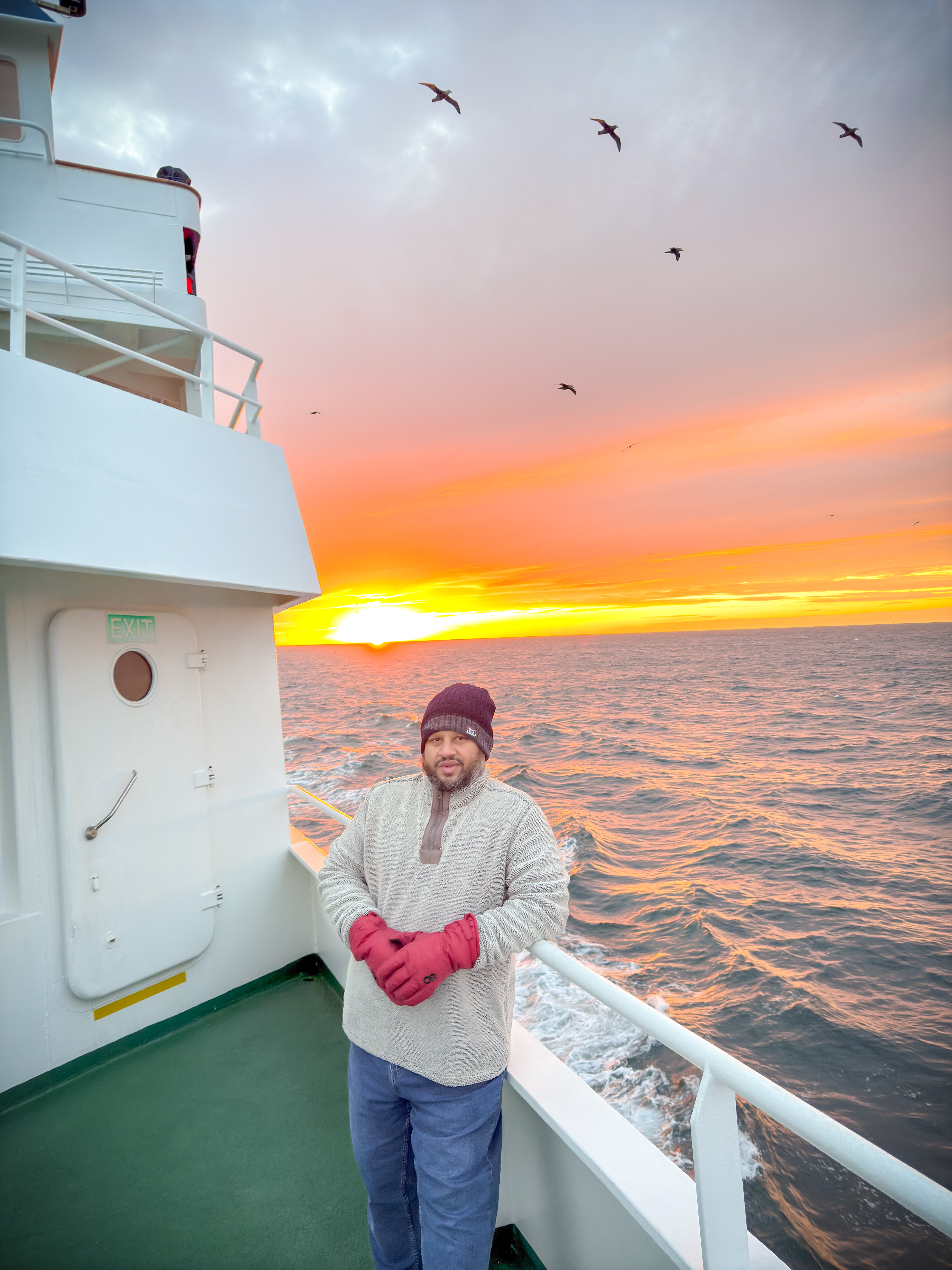 The little blue ship gently rocked in the waves, with seabirds following us along the way. Breakfast was well-attended, which suggests most people are feeling fine and not too many are suffering from seasickness.