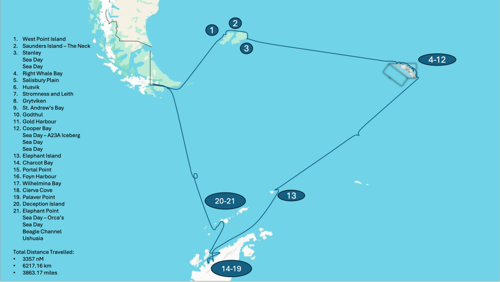 This is the entire trip taking us to the Falkland Islands (Islas Malvinas) to South Georgia and the South Sandwich Islands and then off to the Antarctic Continent
