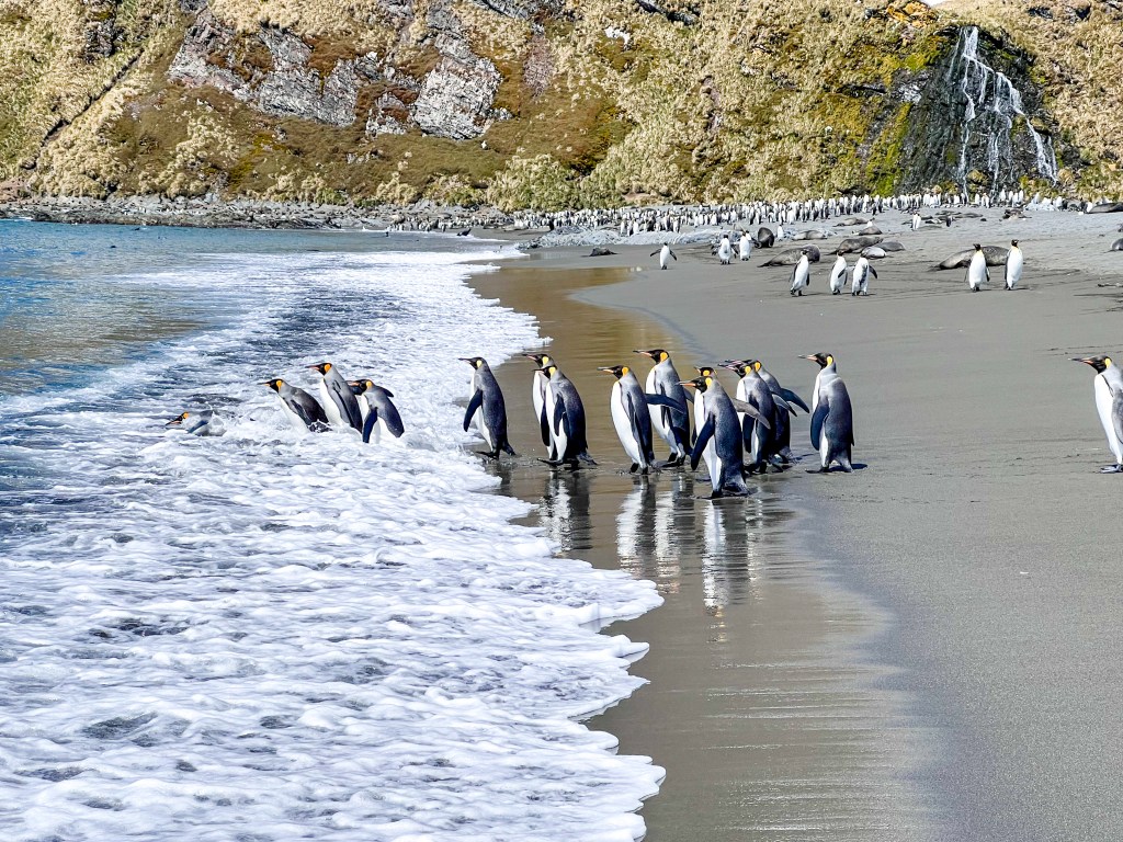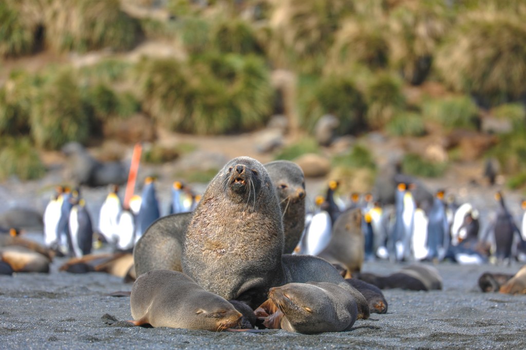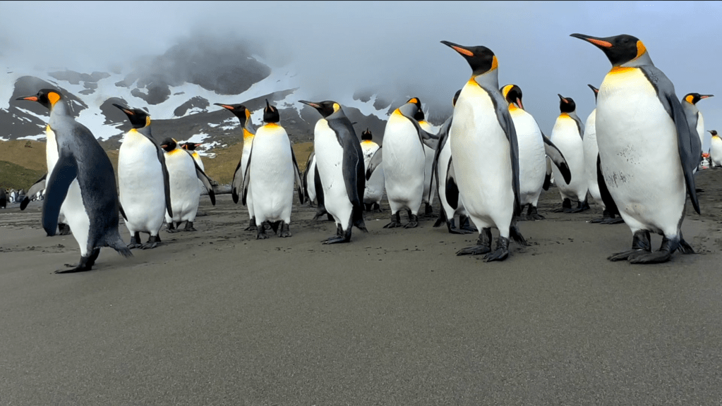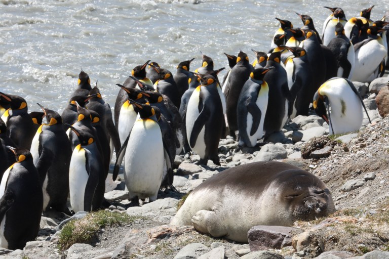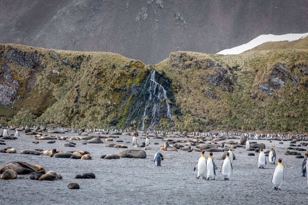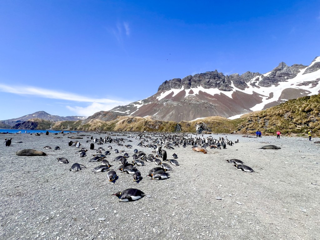 This morning as Plancius approached Gold Harbor, we were met with a beach full of king penguins. The expedition team had quite a challenge finding a safe path through all the wildlife and decided to split our landing into two groups to give the wildlife their space. The first group came ashore, and the gray skies began to clear to blue while we were enjoying the beach and glacial stream full of molting penguins and elephant seals. A few gentoo penguins were seen on the beach and weaving their way through the king penguins on their way to their colony in the tussock grass near the glacier.