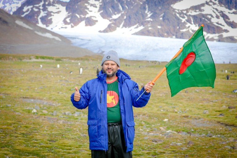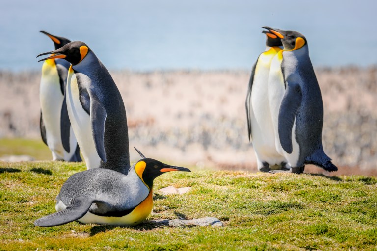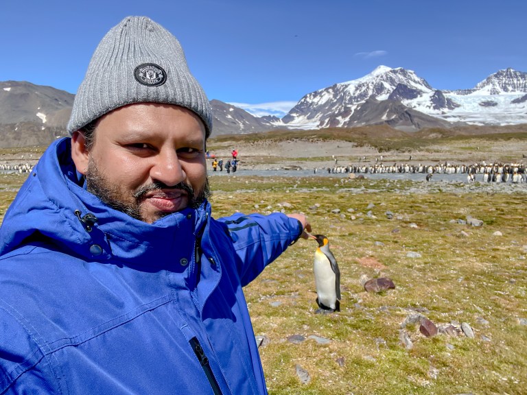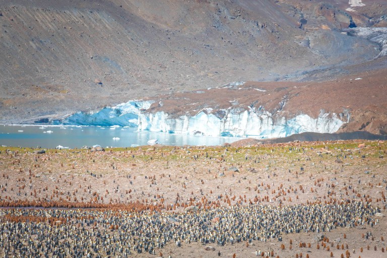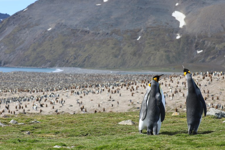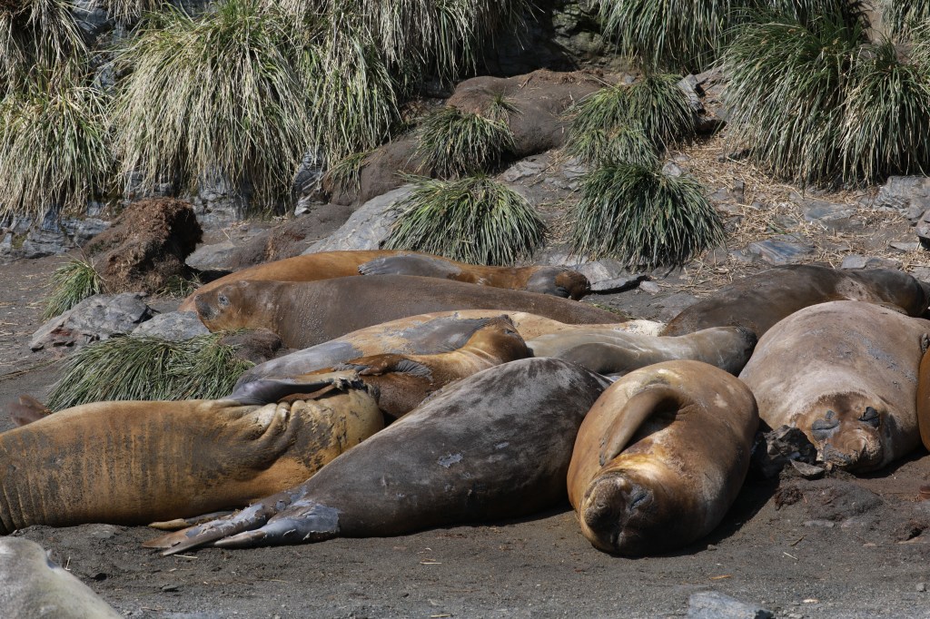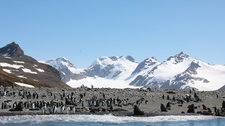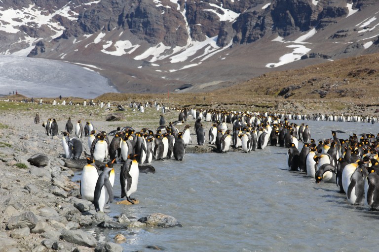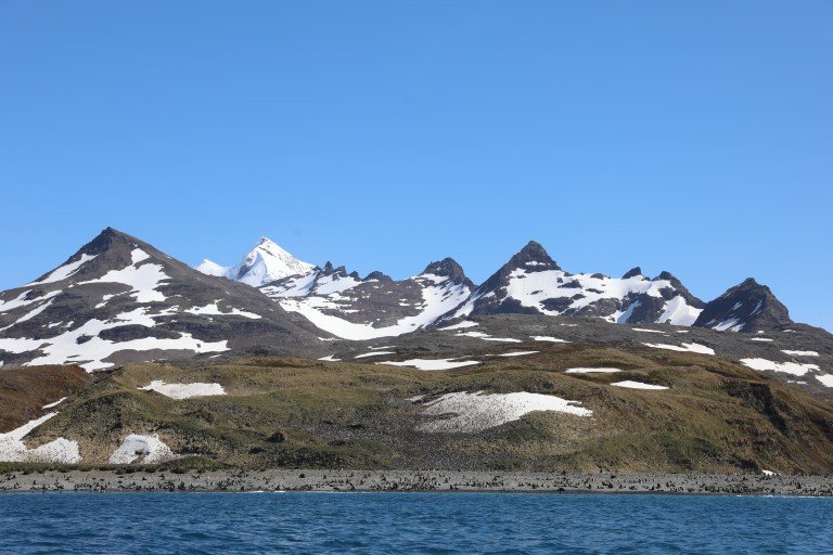 This morning as Plancius approached Gold Harbor, we were met with a beach full of king penguins. The expedition team had quite a challenge finding a safe path through all the wildlife and decided to split our landing into two groups to give the wildlife their space. The first group came ashore, and the gray skies began to clear to blue while we were enjoying the beach and glacial stream full of molting penguins and elephant seals. A few gentoo penguins were seen on the beach and weaving their way through the king penguins on their way to their colony in the tussock grass near the glacier.