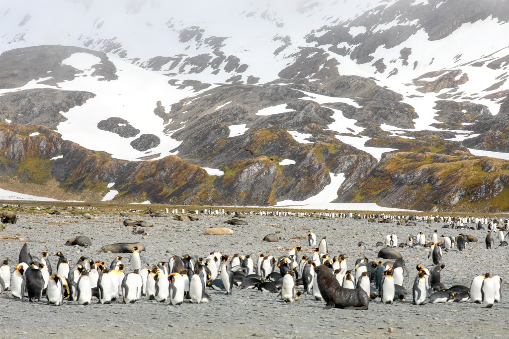 We cruised along the shoreline while enjoying the stretched plains, the wild animals and the stunning snowy mountain backdrops. A bit further ahead we entered a little sheltered lagune where the guides parked the zodiacs on the beach for a close look at the King Penguins gathered there.
